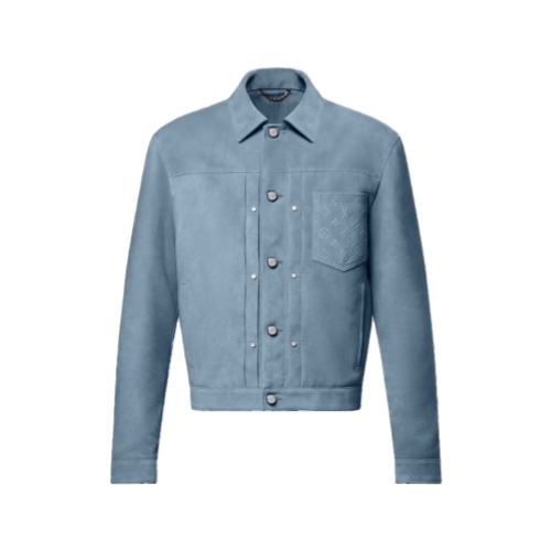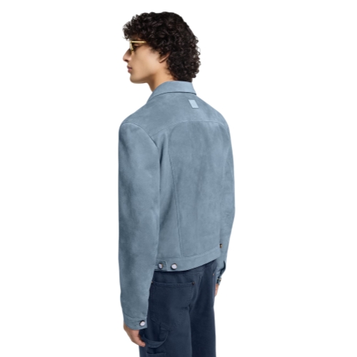 A chic twist on the Type II denim trucker, this suede jacket in smoky blue tones brings a luxurious accent to everyday looks. The soft calfskin suede is elevated with a Monogram-debossed patch pocket on the chest while a Marque L.Vuitton Déposée leather patch adorns the back. Pearl-effect buttons and rivets lend a dandy finishing touch.