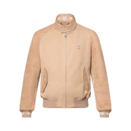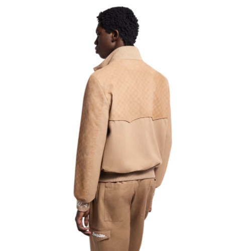This preppy blouson twists a classic silhouette with Damier-embossed suede elements on the back yoke, sleeves and pockets, and a smooth cotton gabardine body. A tonal intarsia Monogram motif adorns the ribbed cuffs and the inside of the collar, while a metal LV ornament adorns the chest. The warm beige tones make this an elegant and versatile buy-now-wear-now piece for all seasons.