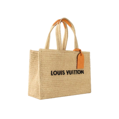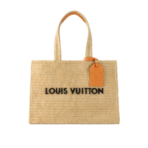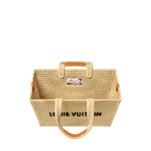 This Shopper Tote takes on a summery feel in natural raffia. The beige of the raffia is juxtaposed with an embroidered black “LOUIS VUITTON” on the front. The tote features an aged-leather removable name tag, adding a vintage touch, and is signed inside with the woven Louis Vuitton cruise label.