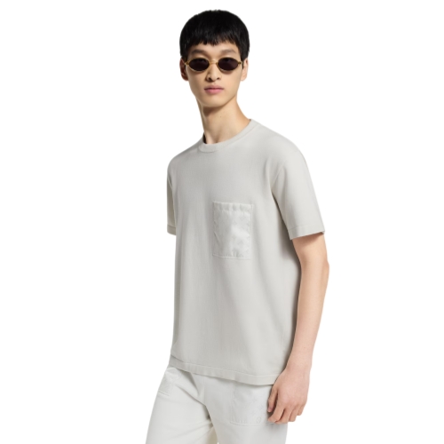 This off-white T-shirt crafted from soft, organic knitted cotton features lustrous tone-on-tone Monogram nylon adorning the patch pocket on the chest and a half-moon panel behind the neck. Perfect for traveling or relaxing, this versatile piece can be styled as a set with a matching reversible bomber and shorts.