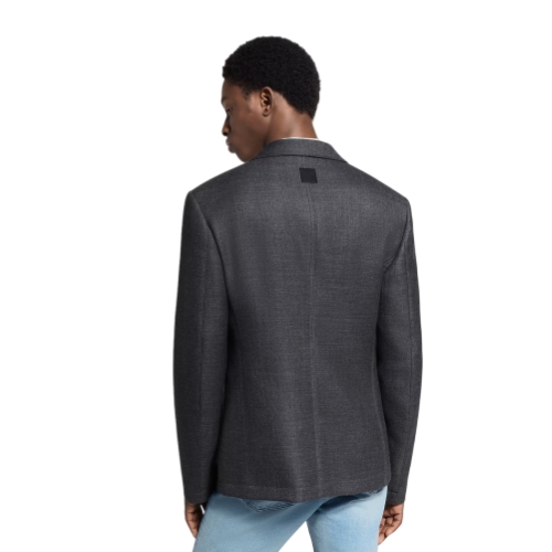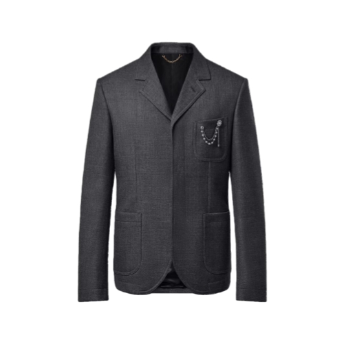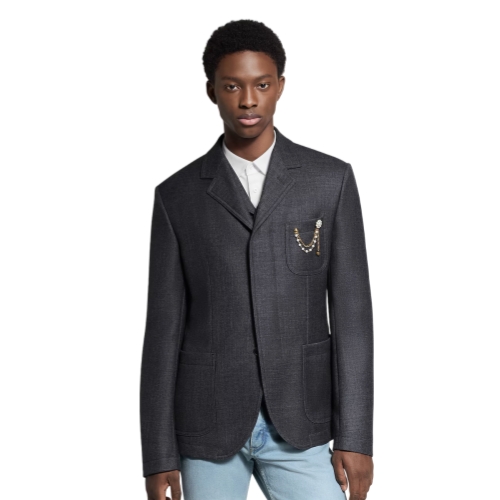 This sleek single-breasted jacket inspired by British sartorial tradition is tailored from fine wool twill in a timeless dark gray. Subtle workwear accents such as the high notch lapel and concealed button placket add a contemporary accent, while a jewel-like detachable brooch adds a sophisticated dandy twist. This piece makes a chic three-piece suit with a matching vest and pants.