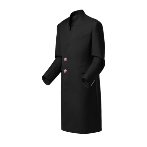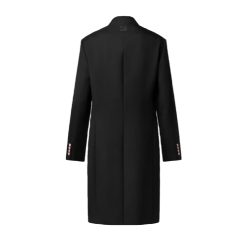 This elegant tailored single-breasted overcoat from the Fall-Winter 2025 collaboration between Pharrell and Nigo is inspired by the latter’s Japanese roots. Cut from black wool-mohair suiting, it is given a contemporary twist with a kimono-style collar. It is fastened to one side with two pink origami Sakura flower buttons adorned with Monogram signatures lending a dandy accent, while a beaded Marque L.Vuitton Déposée patch signs the back.