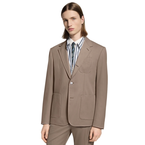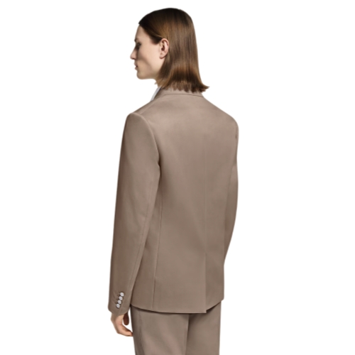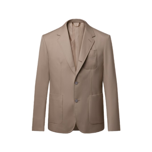 This pale beige single-breasted jacket is tailored with a relaxed fit in fine cotton-silk blend suiting. LV Crown insignia adorns the chest pocket while the notch lapel can be turned up to become an officer collar. Mother-of-pearl effect buttons add a distinguished accent. This piece can be styled as a chic blazer or as a modern suit with matching pants.