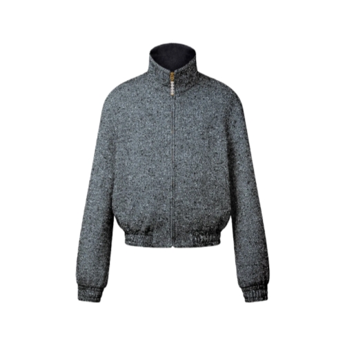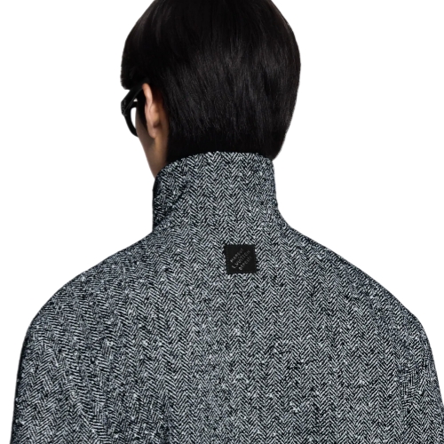 Reinventing sartorial codes, this elegant blouson elevates a tracksuit silhouette in black and white speckled herringbone tweed from the Fall-Winter 2025 show. The fluid silhouette has a tall collar and an elasticated waist and cuffs. A leather Marque L.Vuitton Déposée patch signs the back, while a pearly zipper puller adds a twist of dandy sophistication.