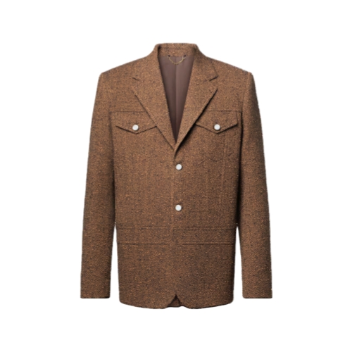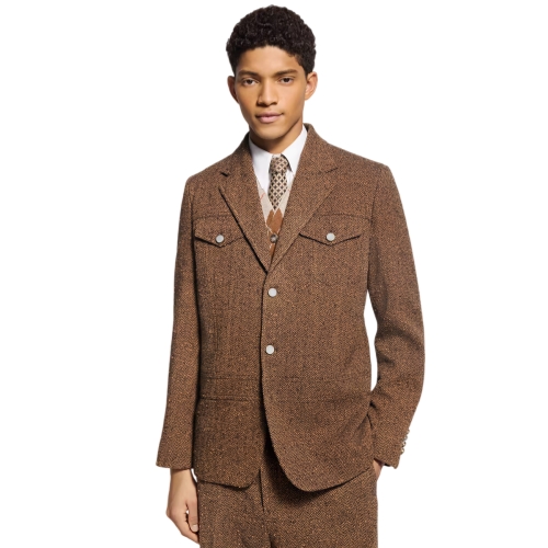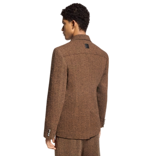 This tailored single-breasted workwear jacket is elevated with fine sartorial details, with a speckled herringbone tweed in rich brown tones and sophisticated pearly buttons. Blending heritage elegance and modernity, it incorporates denim-inspired elements, including flap pockets on the chest and trucker-style ‘v’ line panels. This distinguished piece has matching drawstring pants for a refined look.