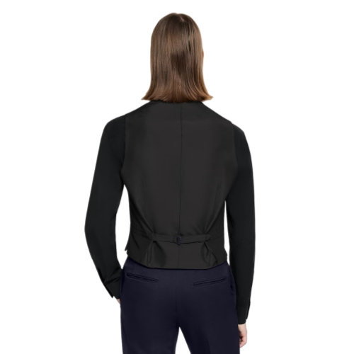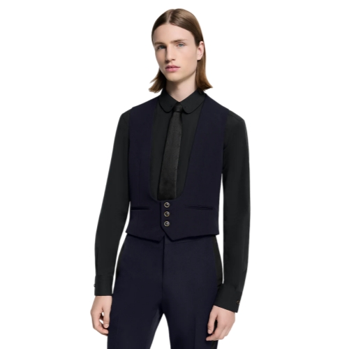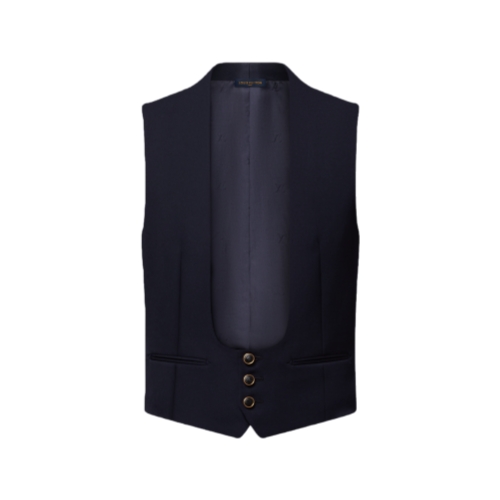 This timeless evening vest is tailored in fine virgin wool grain de poudre suiting in a flattering deep navy blue. It has a plunging neckline with signature buttons and an LV Blason lining. Piped pockets and an adjustable silk faille back ensure a sleek silhouette. A matching jacket and pants make a chic tuxedo suit.