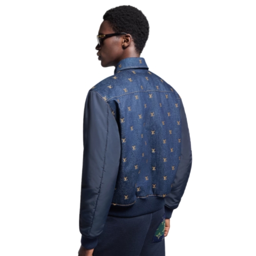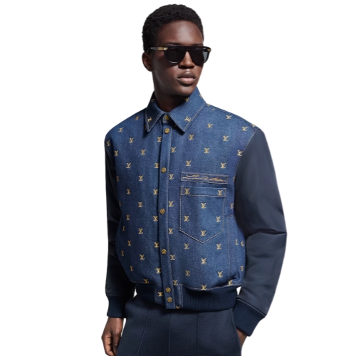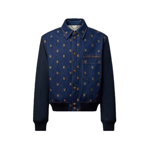 This refined varsity jacket offers a denim twist on a men’s wardrobe essential. The denim body is ennobled with an embroidered allover golden LV Blason motif, while a cursive Louis Vuitton signs the chest pocket. Tonal nylon sleeves and ribbing add sporty accents, while a quilted lining completes this versatile transeasonal style