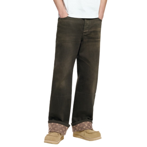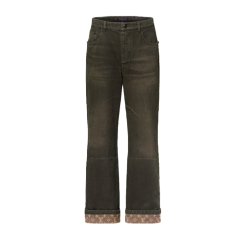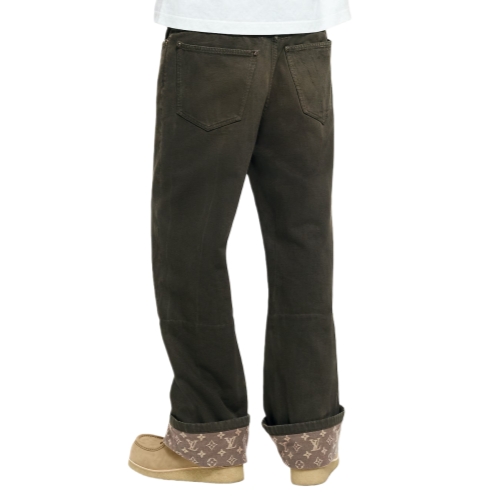 Inspired by the British countryside, these dark khaki denim pants have a waxed treatment lending a vintage patina. A Monogram motif lines the cuffs, which is revealed when they are rolled up to display rugged boots. The back is signed with a Damier leather jacqueron and a topstitched LV on one pocket, while the dark quartz-like button and rivets add a dandy accent.