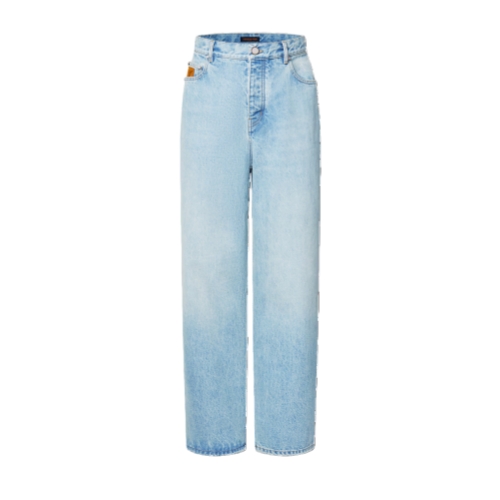These wide leg jeans, crafted from premium Japanese denim, are a wardrobe essential enhanced with the Louis Vuitton savoir-faire. With their timeless light blue wash and their statement silhouette, they can be effortlessly styled with any look. Exclusive details include tobacco-toned topstitching, an embroidered LV signature on a rear pocket and signed nubuck patches on the ticket pocket and waist.