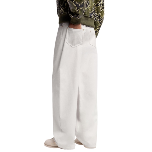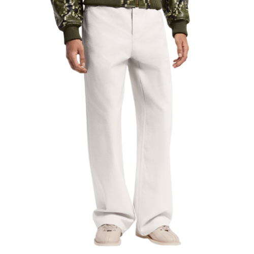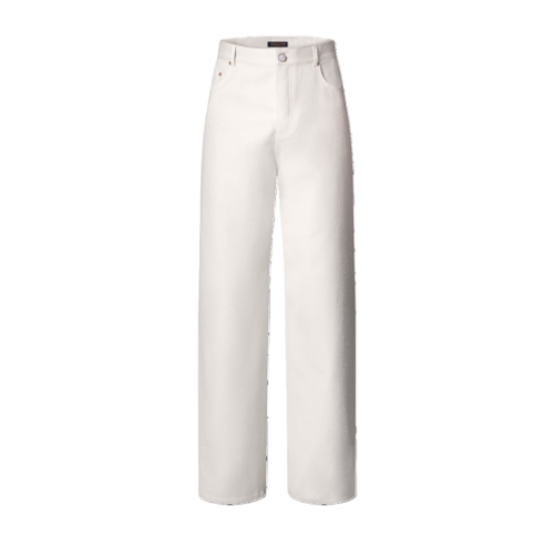 Offering a luxurious twist on jeans, these summery wide-legged pants are crafted from white silk-cotton blend fabric with a pleasing raw finish to the weave. Their relaxed silhouette is signed with an embossed LV leather patch on the ticket pocket and adorned with gold rivets and a pearl-effect button fastening. This effortless and refined piece works with daytime or evening looks.