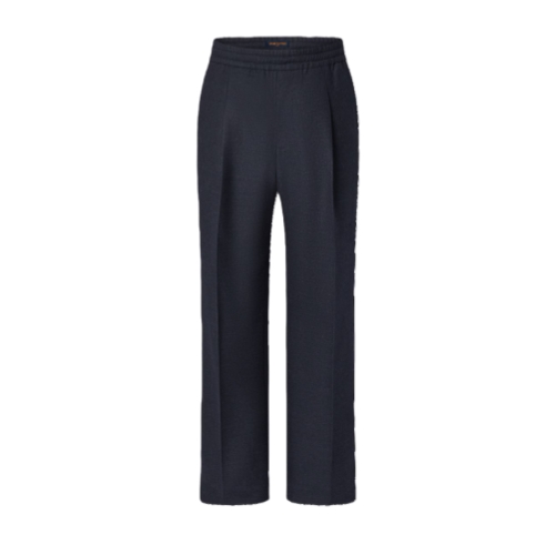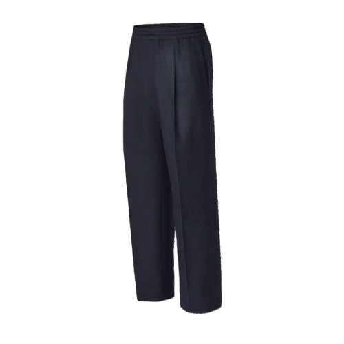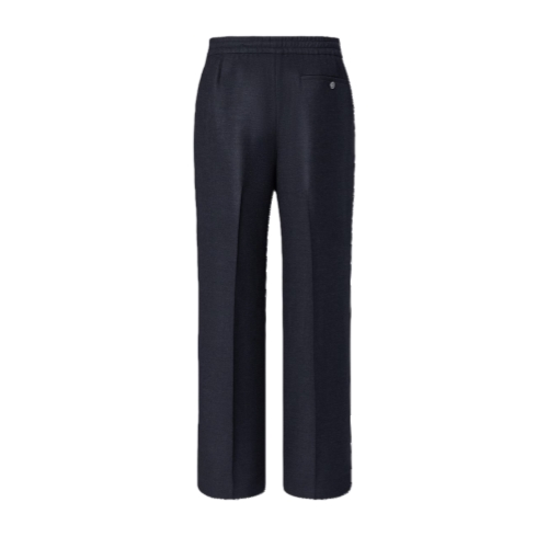 These draped pants cut from soft, navy blue wool flannel are an effortlessly elegant piece for winter with a pleated front and comfortable drawstring waist. A Monogram Flower button adds a discreet signature on the piped rear pocket. These pants can be worn as a suit with a matching blazer bringing a relaxed mood to tailoring.