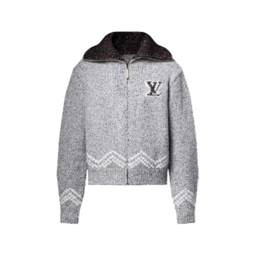 This pebbly gray knitted blouson has a handcrafted vibe. It has an embroidered LV on the chest and is adorned with a colorful intarsia design on the back from the Fall-Winter 2025 collection. The motif celebrates the long-standing friendship behind this season’s collaboration between Pharrell and Nigo, depicting the two artists on a fishing boat in an idyllic setting. A pearl-embellished zipper puller gives this piece a chic finishing touch.