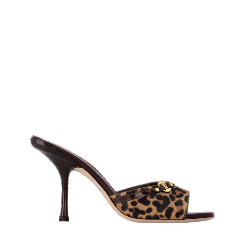 The 6AM mule is reimagined in hairy calf leather with a perennially stylish leopard print. This model is notable for its wide front strap, which features a narrow, decorative strap in patent leather embellished with a gold-toned LV Initials accessory and two tiny studs. It comes on a high heel with a distinctive flared shape.