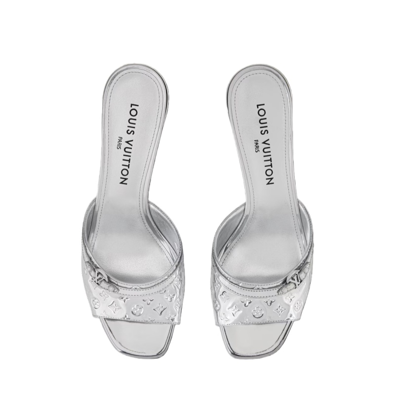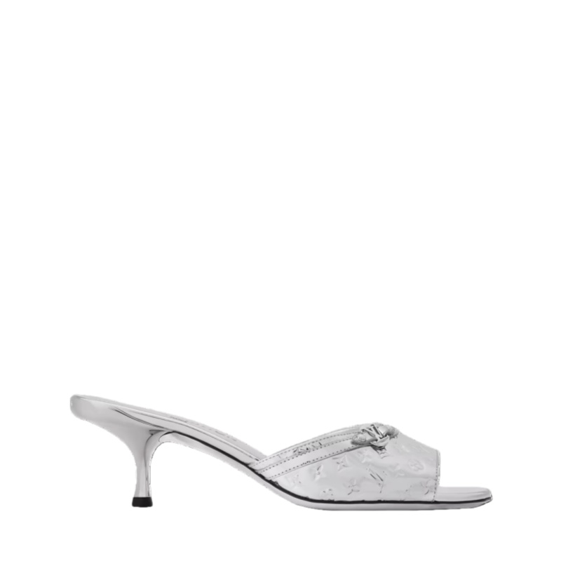 The 6AM mule is reimagined this season in striking mirror-effect calf leather embossed with the Monogram pattern. The front strap is embellished with a slender, decorative strap, which is signed with an LV Circle accessory. This glamorous style comes on a kitten heel, which is both feminine and easy to wear.