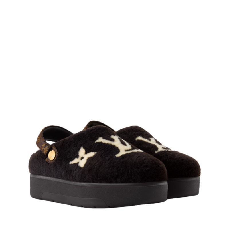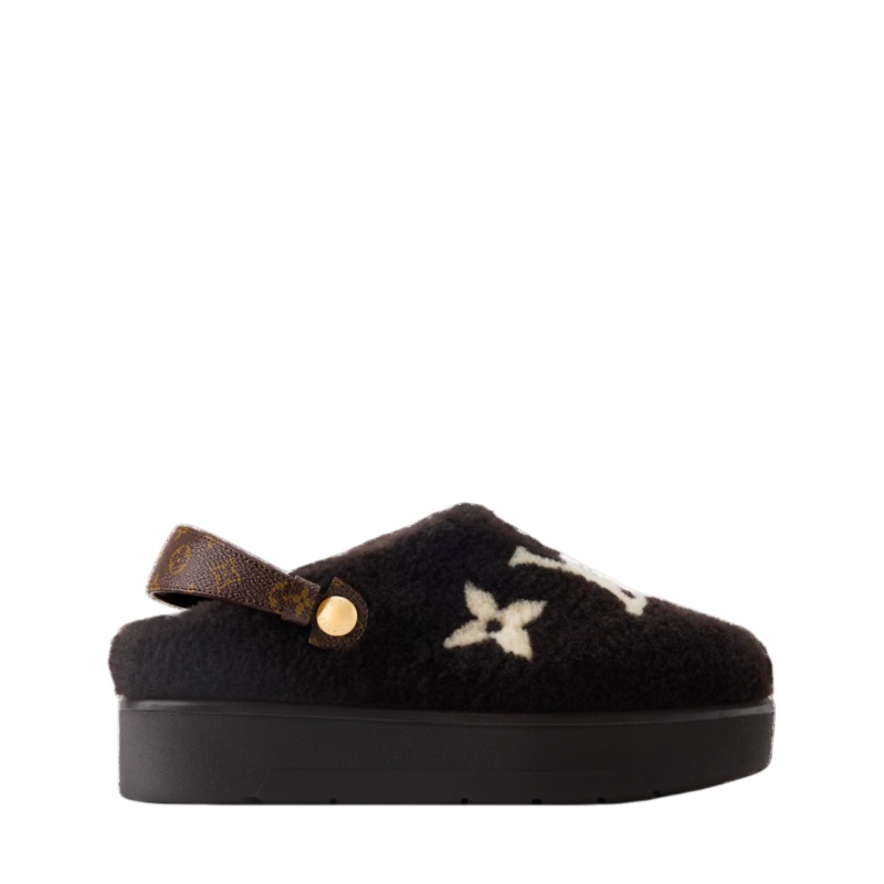 The Aspen platform closed mule is made of shearling with an intricate intarsia pattern of the LV Initials and Monogram Flowers. This relaxed style, which also has a shearling lining and footbed, is complemented by a removable strap in Monogram canvas, which can be worn either at the front or back. It comes on a rubber flatform outsole.