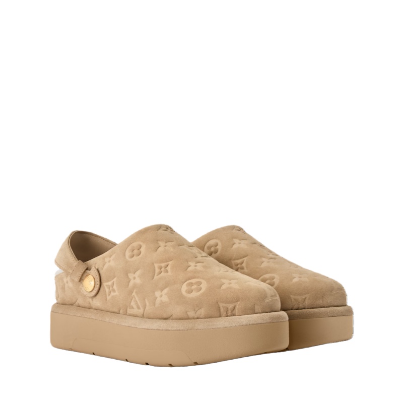 The Aspen platform closed mule is reimagined in velvety suede calf leather debossed with the Monogram pattern. A soft and warm shearling lining further enhances the comfort of this relaxed, easy-to-wear style, which comes on a rubber flatform outsole. Its removable strap, secured with engraved, gold-toned studs, can be worn at the front or back.