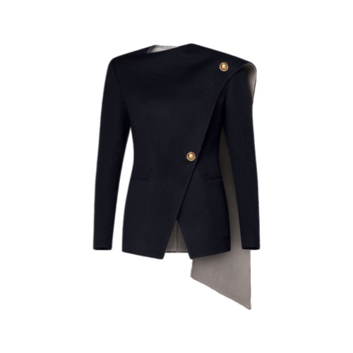 This jacket is a masterclass in modern sophistication, cut from sumptuous double-face cashmere in a clean, tapered shape with a graphic scarf detail sweeping over the left shoulder to reveal a contrasting reverse. Welt pockets nod to sharp tailoring codes, while two of this season’s metallic buttons add a refined finishing touch to the front.