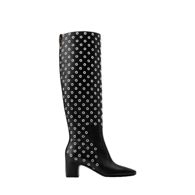The Avalon high boot is made of grained calf leather and embellished with silver-toned eyelets, which give it an armor-like appearance. Designed for striding out, this model has a square toe, a stable block heel and a tubular shape allowing it to be pulled on with ease. It is signed at the back with trim in Monogram canvas.
