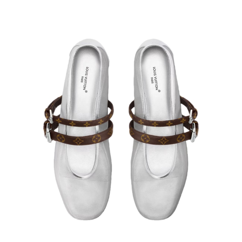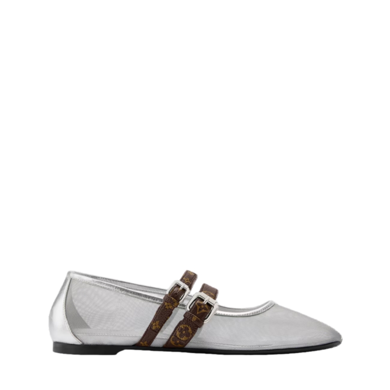 The Ballet ballerina draws inspiration from the mesh footwear seen at the Louis Vuitton Fall-Winter 2025 women's show. It is crafted from shimmering nylon mesh with trim in metallic calf leather for a look that is both modern and timeless. This ballet pump is embellished with two straps in Monogram canvas with silver-toned buckles.