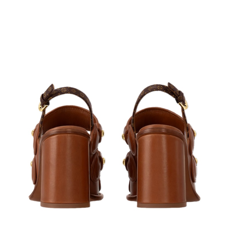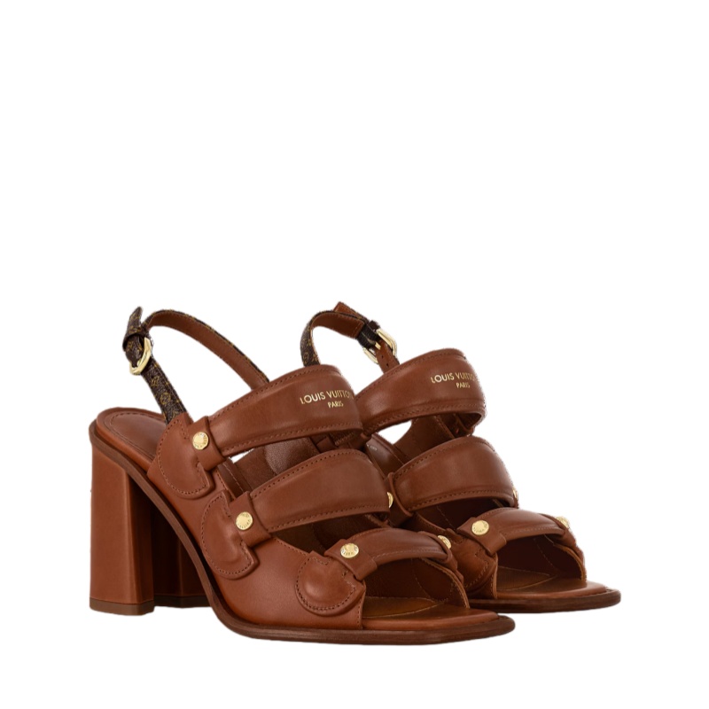 The Berlin sandal is an elegant and original style crafted from smooth calf leather. Its three front straps, one of which is embossed with the Louis Vuitton signature, are shaped like the handles of the House's historic trunks. This model is complemented by engraved metal studs, an adjustable back strap in Monogram canvas, and a high block heel.