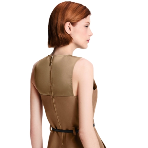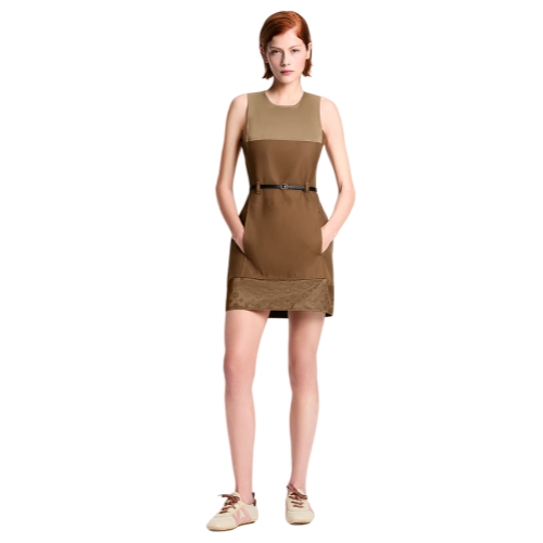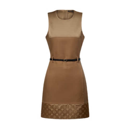 This dress is crafted from a combination of structured cotton gabardine and lustrous nylon accents for a chic play of structure. It is crafted in a tapered fit with a slim lambskin leather belt highlighting the waistline, while a subtle tone-on-tone Monogram motif signs the hem. Complete with an exposed zipper fastening at the back.