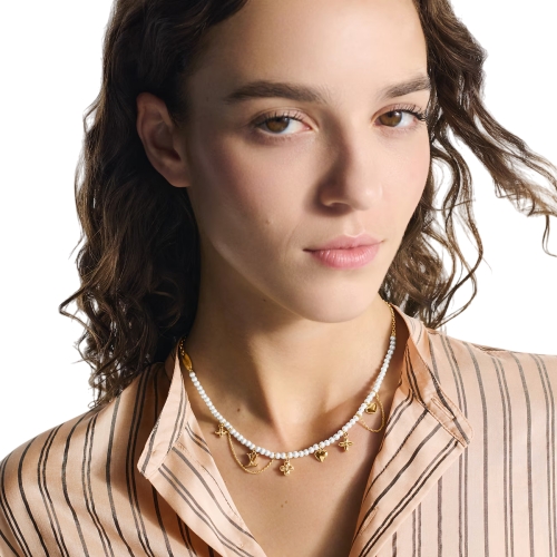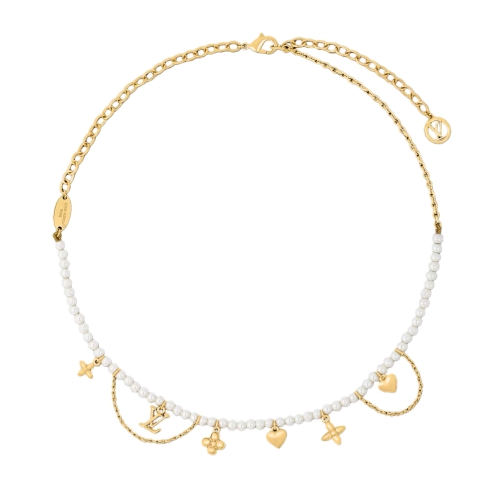 The Blooming Pearls necklace highlights the House’s iconic emblems in a strikingly sophisticated composition. A strand of lustrous glass pearls is adorned with an array of enchanting pendants, combining the LV Initials and Monogram Flowers with two precious hearts, all in gold-toned metal. Its aura of simple refinement adds a resplendent finishing touch to an elegant outfit.