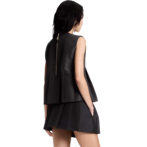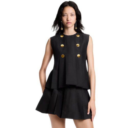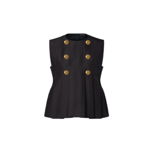 This top is chic and structured in wool-silk mikado finished with stitched pleats that fan out beneath the bust to add gentle volume to the silhouette. The front is detailed with two rows of golden Louis Vuitton-engraved buttons for a preppy double-breasted effect, while the back is fastened with an exposed zipper.