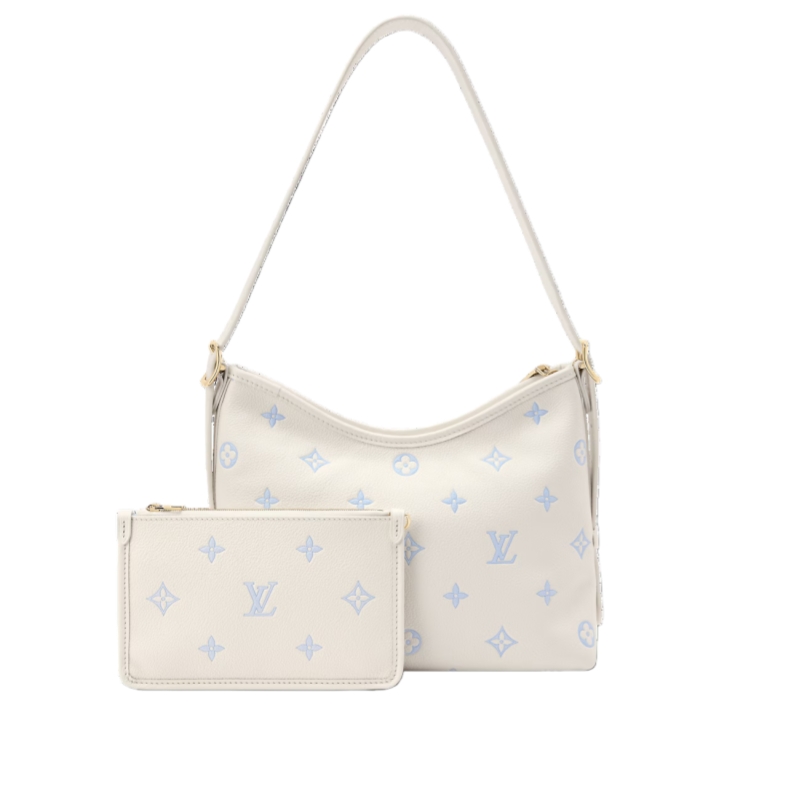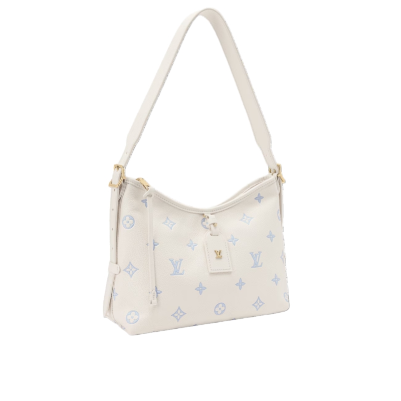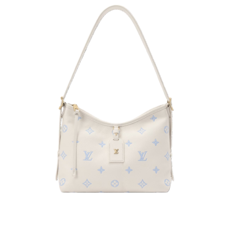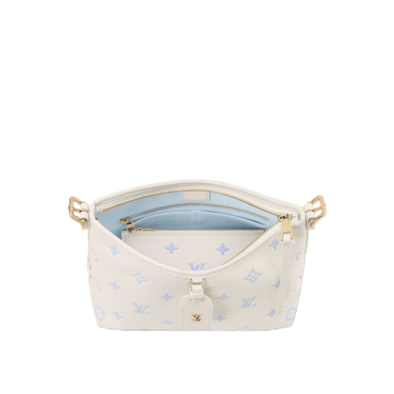 Ideal for weekends in the city, the CarryAll PM is sized to fit the essentials, plus some extras like a book and sunglasses. This edition is crafted from the House's Monogram Empreinte leather in a chic Milky White and Blue palette, adorned with light gold-toned hardware. It features a decorative name tag, which is a Louis Vuitton signature, and includes a removable zipped pocket.