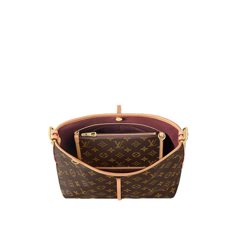 Combining allure with body-friendly design, the CarryAll PM handbag in Monogram canvas with natural leather trim is a go-everywhere city bag. Great storage capacity and a smartly designed interior, with two inside small flat pockets, makes it practical. A detachable zipped pouch, also in Monogram canvas, is attached to the bag by a leather strap.
