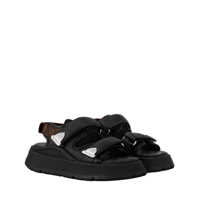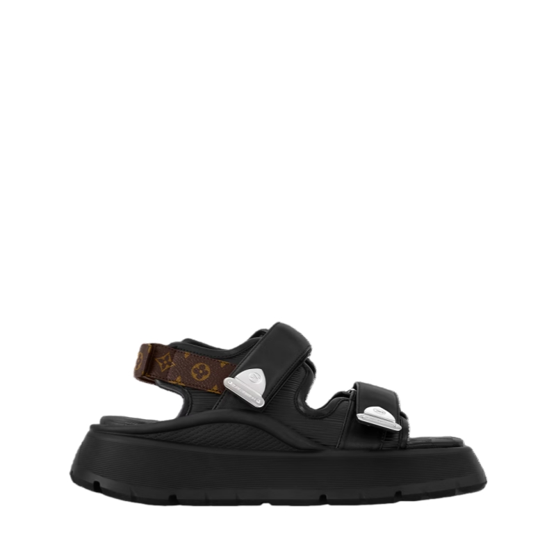 The Chameleon platform sandal is a comfortable, go-anywhere style in calf leather. It features three adjustable velcro straps: two at the front, with metal accessories inspired by trunk corners, and one at the back, in Monogram canvas. It comes on a chunky yet lightweight platform outsole with a wave detail referencing the LV Archlight sneaker.