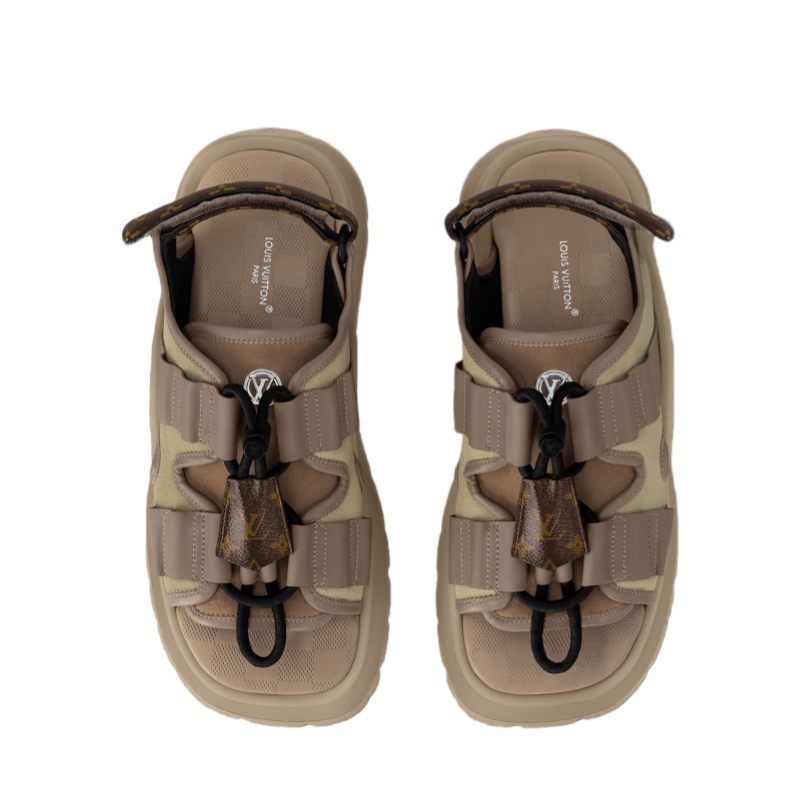 This edition of the Chameleon platform sandal comes in a mix of materials, including canvas and suede calf leather. First seen at the Cruise 2025 fashion show, this avant-garde model is embellished with a cartridge-belt detail in leather and a key bell in Monogram canvas. It is finished with a comfortable padded insole and rubber platform outsole.
