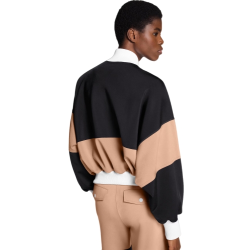 This zip-up bomber jacket is refreshed with a modern, sporty look in the House’s go-to technical jersey. It is crafted in a graphic color-blocked finish with contrasting ribbing highlighting the collar, waistband and cuffs. Exaggerated snap-button pockets add a play of proportion to the boxy silhouette, while a Louis Vuitton Paris patch subtly signs the chest.