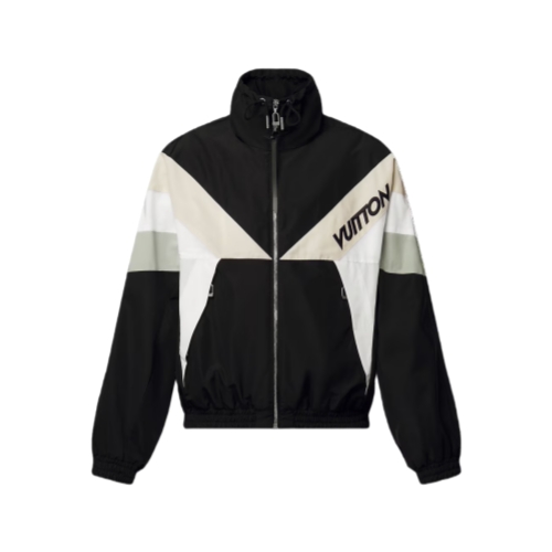 This zip-up windbreaker has a fresh, graphic feel in a lightweight cotton-nylon blend in a dynamic color-blocked construction. It is crafted in a relaxed fit with elasticized hems and a cozy high neckline with a drawstring to keep out the cold. Two fastened side pockets add a practical touch, while a sporty “Vuitton” signature completes the look.