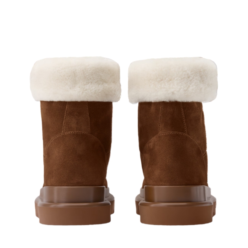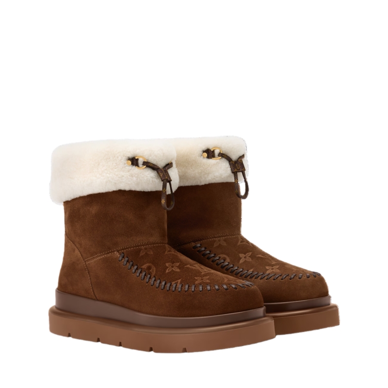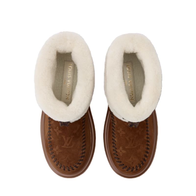 The Cortina ankle boot combines an upper in suede calf leather with a snug shearling lining. Part of the LV Ski capsule, this model is distinguished by refined signatures, including a Monogram-pattern vamp and leather laces finished with an LV Circle accessory. Perfect for both winter escapes and city life, it comes on a slip-resistant rubber outsole.