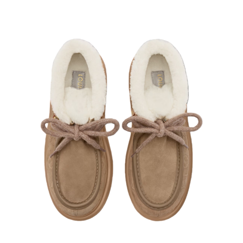 The Cortina low boot is a winter-ready style belonging to the LV Ski capsule collection. It combines an upper in Monogram-debossed suede calf leather with a warm and fluffy shearling lining and a slip-resistant rubber outsole. Thick laces with natural leather trim complete this versatile design, a stylish option for both the slopes and the city.