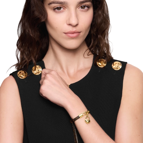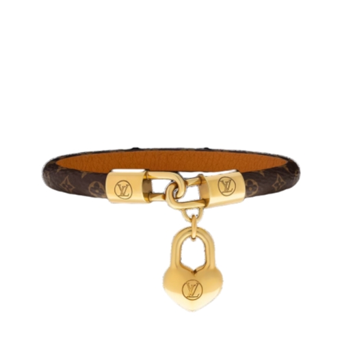 In Monogram canvas, the new Crazy In Lock bracelet wears a charming heart-shaped padlock, finely engraved with the LV Circle signature. This feminine, collectible piece makes a most romantic little gift.