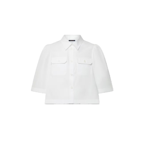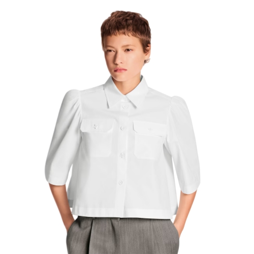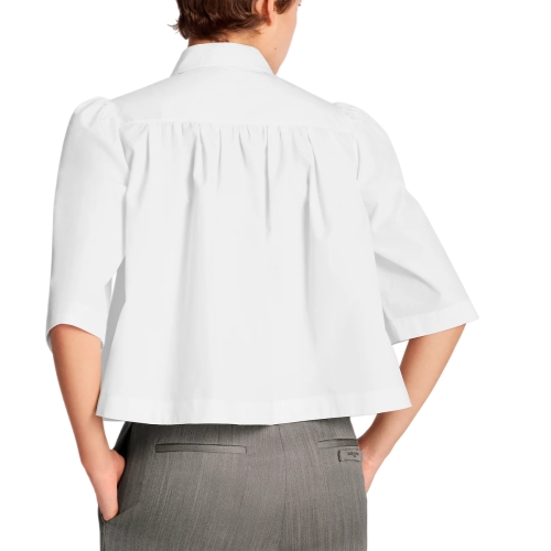 This button-front shirt is smart and chic in a cropped shape with a crisp collar and elegant elbow-length sleeves tailored from lightweight cotton poplin. Two flap pockets add a touch of structure to the chest, while gathering across the back and around the shoulders introduces breezy volume for a romantic look.