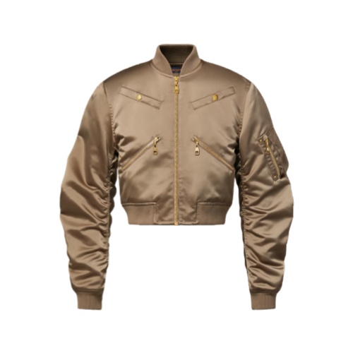 This bomber jacket makes a sporty statement in soft, lustrous nylon satin with tonal ribbing around the collar, cuffs and waist. It is crafted in a chic cropped shape with ruching running the length of the arms for added volume and texture. Multiple fastened pockets introduce a utility feel, while a V-shaped Monogram insert signs the back.