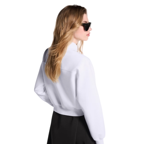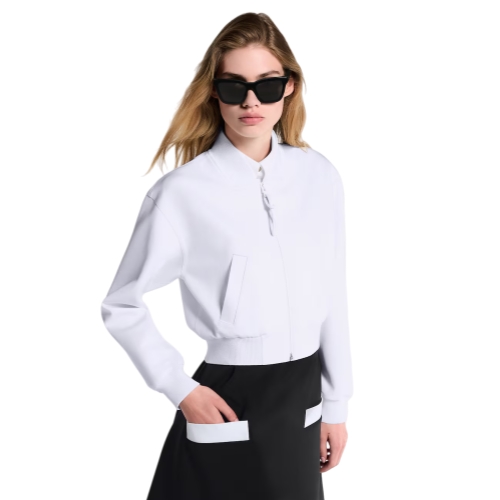 This bomber jacket is reworked with contemporary codes for a clean, sporty look. It is cut in a cropped shape from the House’s iconic technical jersey, while the collar, cuffs and waistline are finished with exaggerated ribbing for a trim fit. The front is fastened with a coated zipper, and two side pockets complete the look.