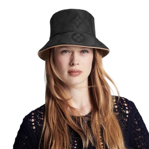 Stylish and versatile, the reversible Dailygram bucket hat is sure to become an everyday essential. One side features a tone-on-tone XXL Monogram jacquard weave for a contemporary signature look. Turned inside out, it reveals a gold embroidered Louis Vuitton signature for a more classic feminine effect. Natural cowhide piping adds a luxurious finishing touch.