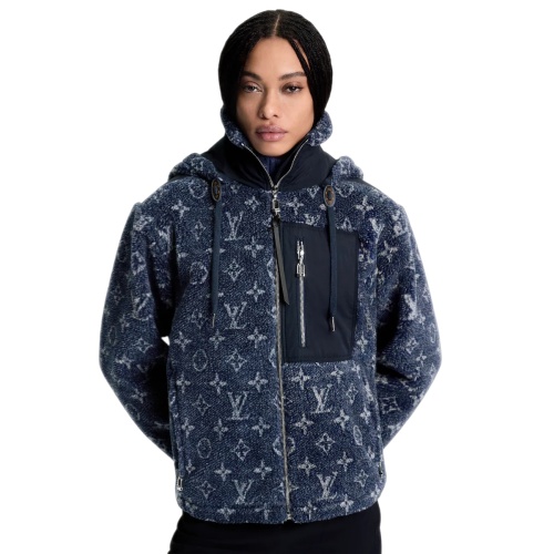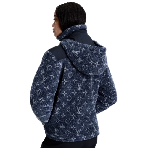 This jacket makes a modern signature statement in cozy wool-blend fleece featuring a scaled-up Monogram motif in a sophisticated denim effect, while plain cotton inserts add a contrasting accent to the chest pocket, high neckline and shoulders. A removable drawstring hood and two side pockets complete the practical winter style.