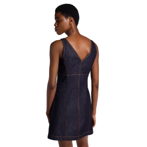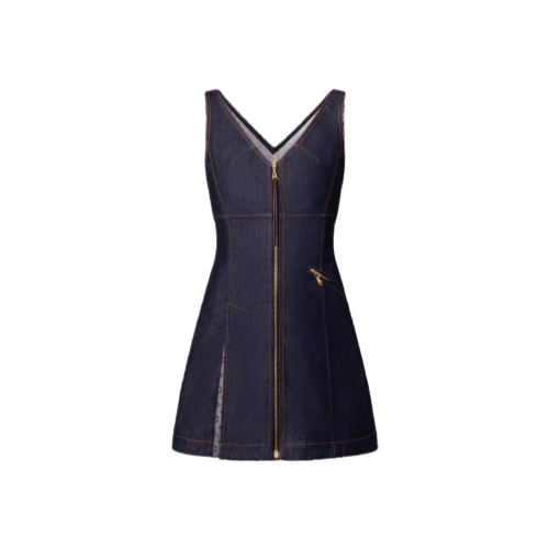 This mini dress has chic, everyday appeal in dark-wash denim cut with a fitted V-neckline top and an A-line skirt for a feminine silhouette. The front is detailed with a full-length exposed zipper trimmed with a Monogram canvas pull, which is complemented by a fastened slanted pocket on the hip.