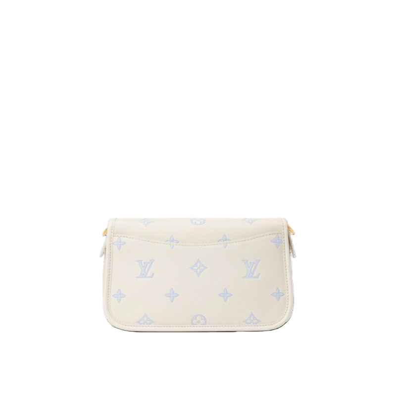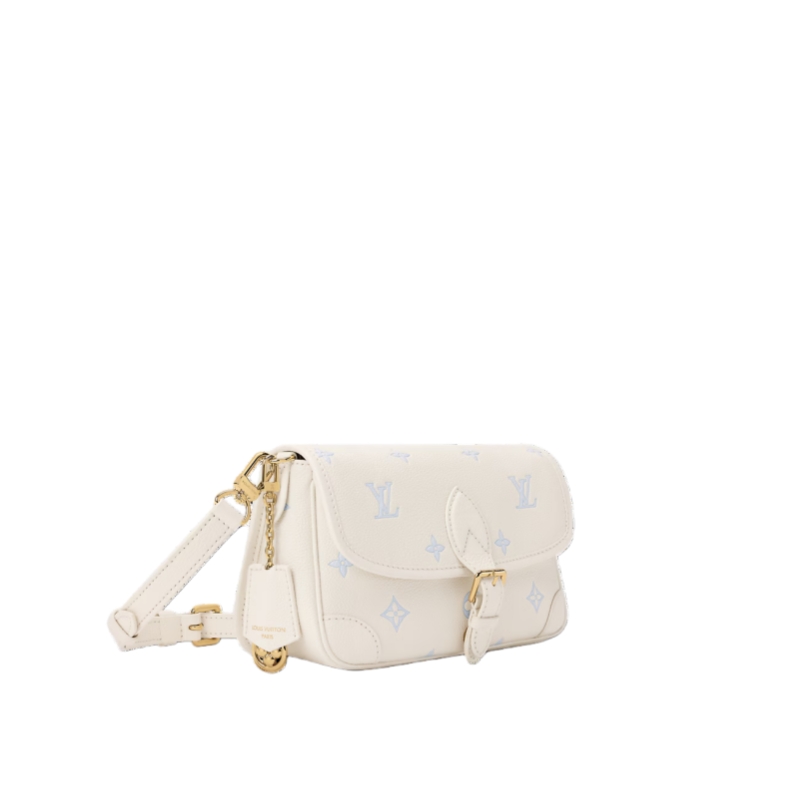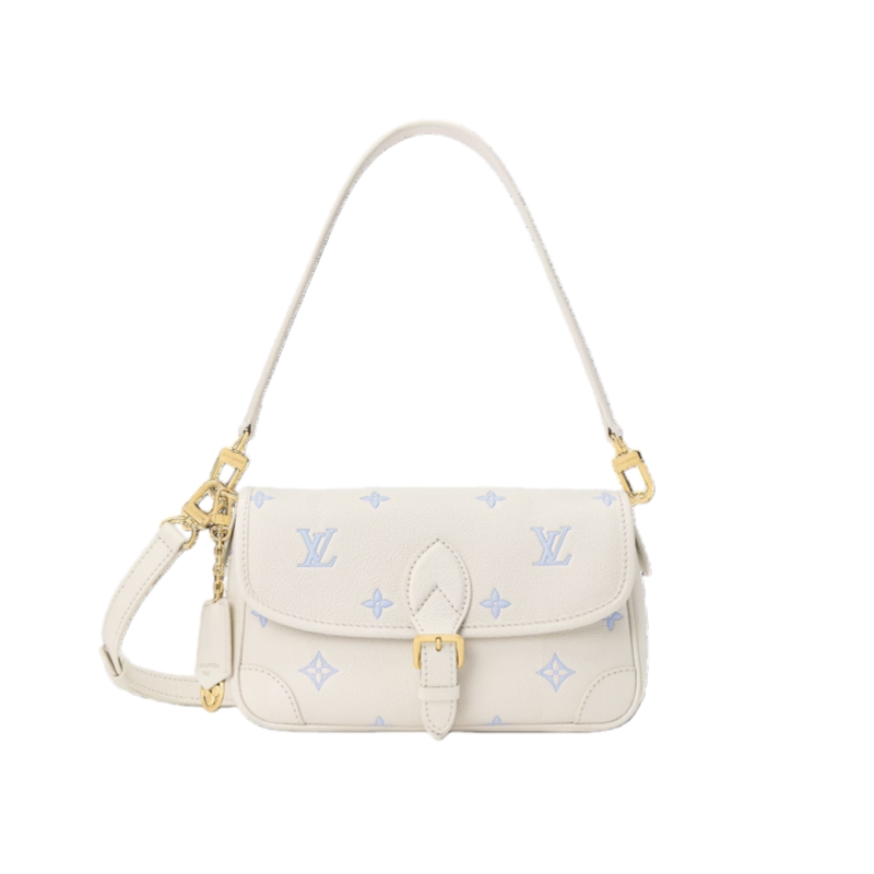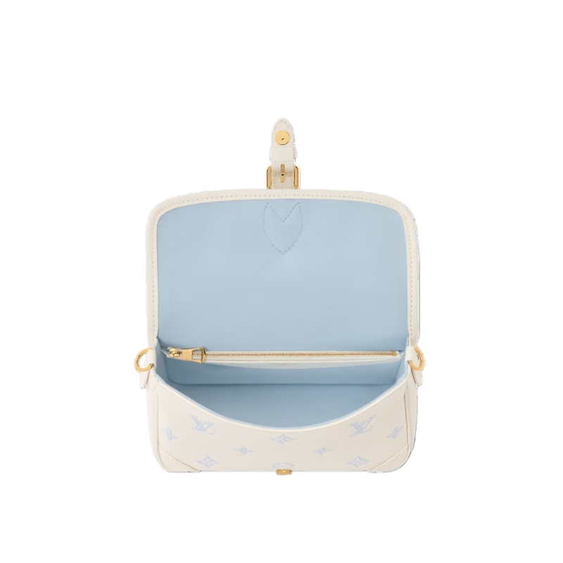 The Diane handbag is reimagined in a chic bi-color palette in elegant shades of Milky White and Blue. This contemporary edition is crafted from Monogram Empreinte leather and is adorned with light gold-toned hardware. Elevated with a removable LV charm, it opens to reveal a flat zipped pocket to keep smaller items secure.