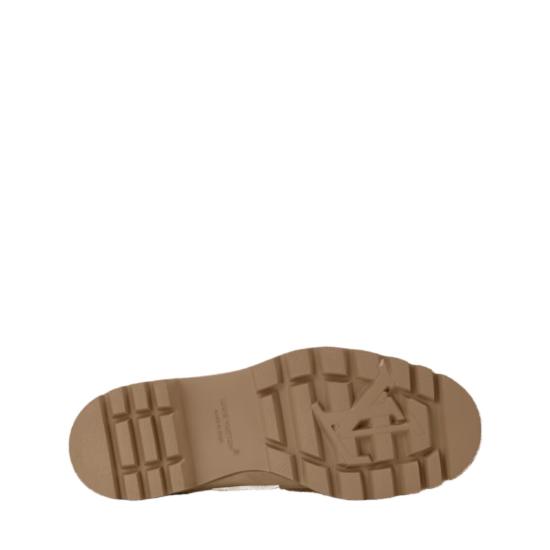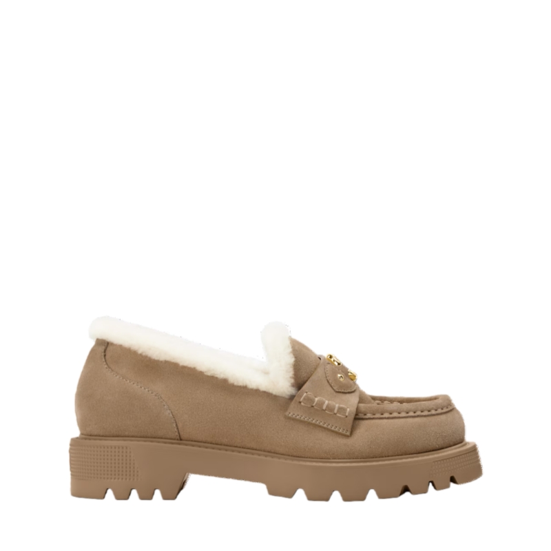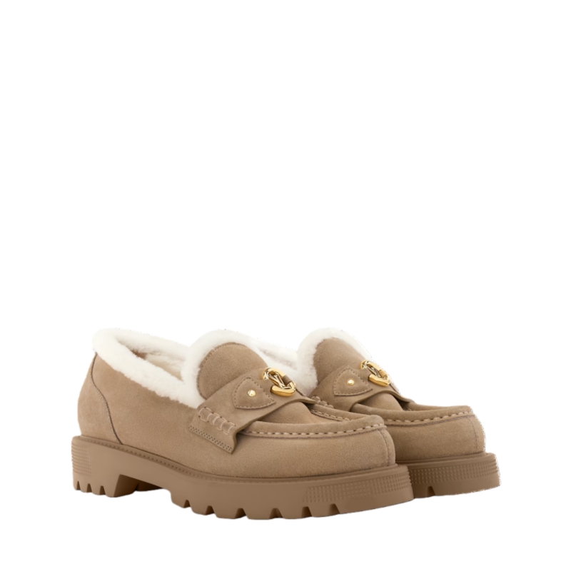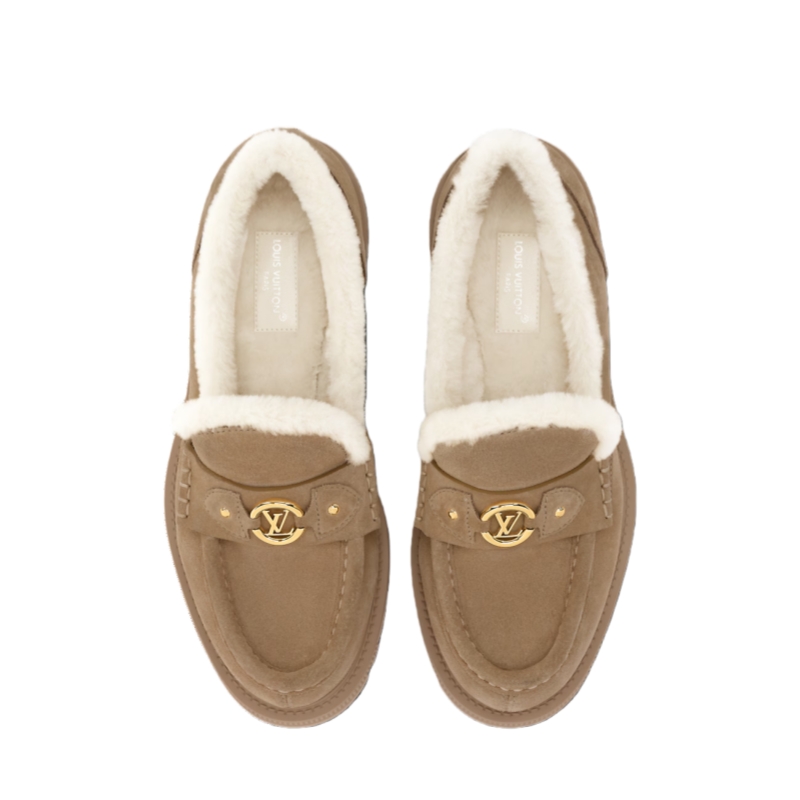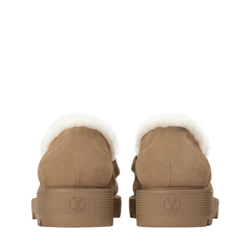 The District loafer is ready for winter in soft suede calf leather with a fluffy shearling lining, which is visible as trim around the upper. The front strap is signed with a gold-toned LV Circle accessory. This chic, boyish model comes on a lightweight EVA outsole with a pronounced tread and textured sections at the front and back.