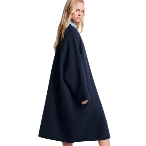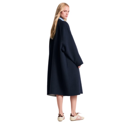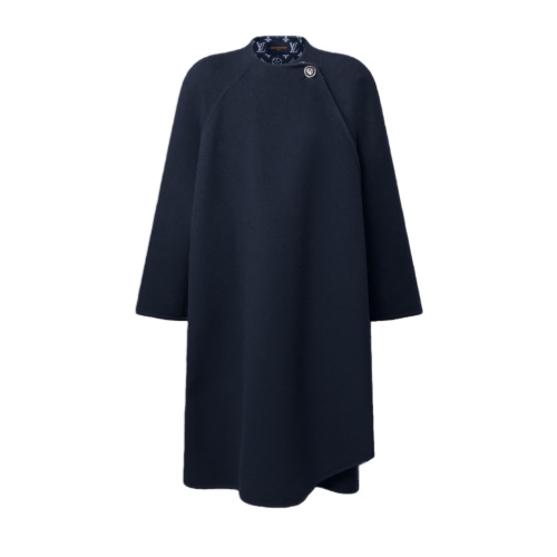This coat is effortlessly elegant in a long, loose silhouette crafted from a cozy double-face blend of wool and silk. It is fastened to the left of the neckline with a single metallic button, which allows the front to drape fluidly and reveal a glimpse of the graphic Monogram signature on the inside.