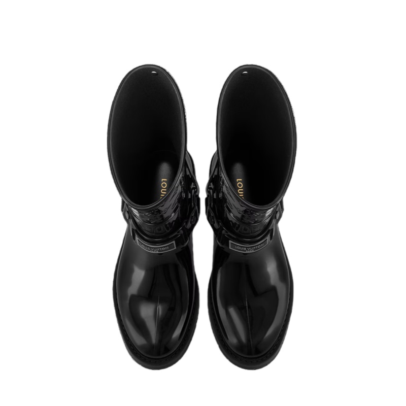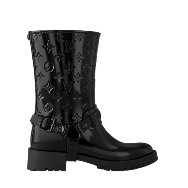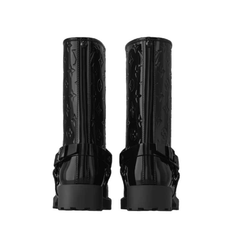 The Drops flat half rain boot is given a Western twist with an adjustable harness inspired by cowboy boots. This fully waterproof rubber boot is notable for its many signature details, including a Monogram-embossed shaft and a Louis Vuitton tag on the harness. It is finished with a sturdy rubber outsole, ideal for walking in wet weather.