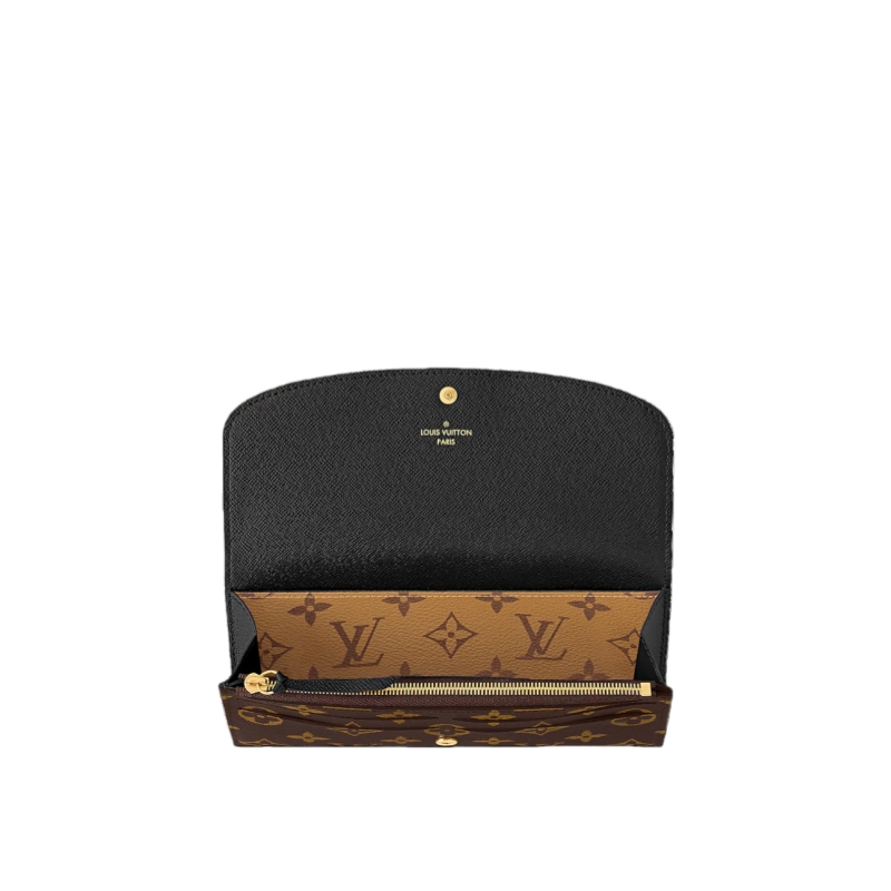 This edition of the Emilie wallet combines Monogram and Monogram Reverse canvas for a sophisticated, modern look. Distinguished by its sleek design and rounded flap, this wallet slips easily into most bags, and can even double as a clutch. Its neat interior offers many practical features, while there is an additional flat pocket at the back.