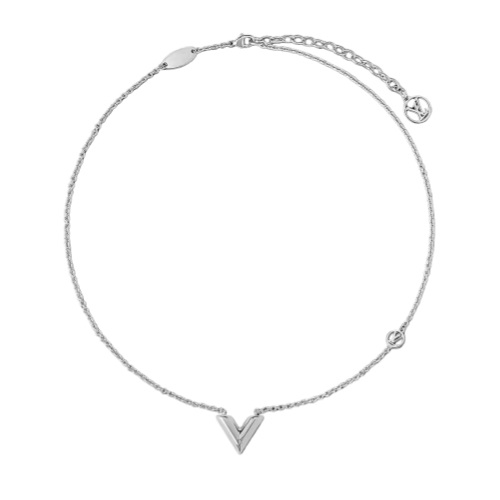 A bright silver-color finish gives the Essential V jewelry line a modern look signed discretely. This supple necklace combines Louis Vuitton's graphic V motif with the LV Circle signature on the chain and clasp.
