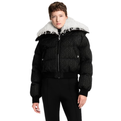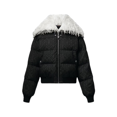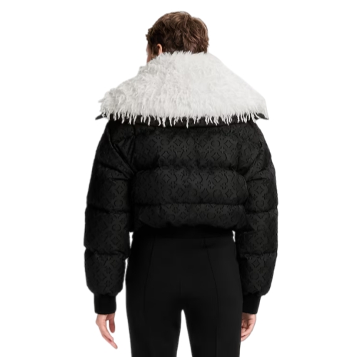 This zip-up puffer jacket is crafted from lightweight nylon and padded with down for a cozy, voluminous silhouette. It is subtly signed all over with the iconic Monogram motif in relief, while the shoulders are highlighted with a large collar trimmed with contrasting faux feathers for a chic après-ski statement.