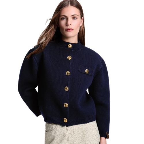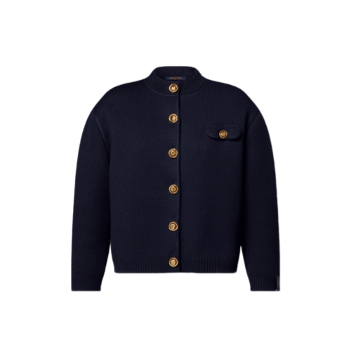 This cardigan has a refined, modern feel in a cozy wool blend finished with chunky ribbed hems and discreet topstitching. Large metallic buttons add a polished detail to the front fastening and flap pocket on the chest, while a Monogram canvas tab discreetly signs the left sleeve.